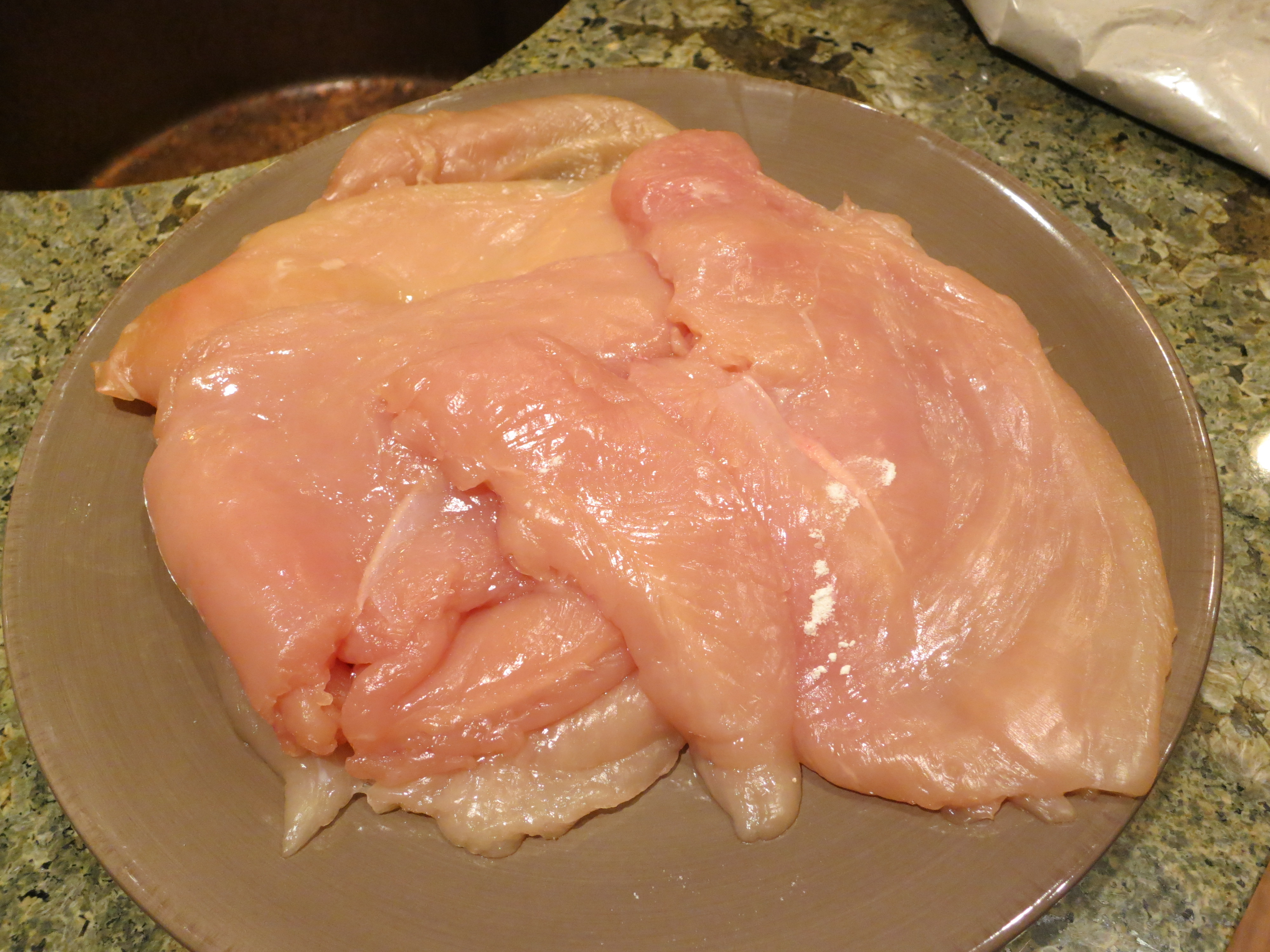 Place chicken between plastic wrap or in a Ziploc bag.  With a meat mallet or rolling pin, pound the chicken until thin (about ½ inch or thinner).  *You can also very politely ask your local butcher to pound them thinly for you and they usually have no problem doing it.  Saves you a step!