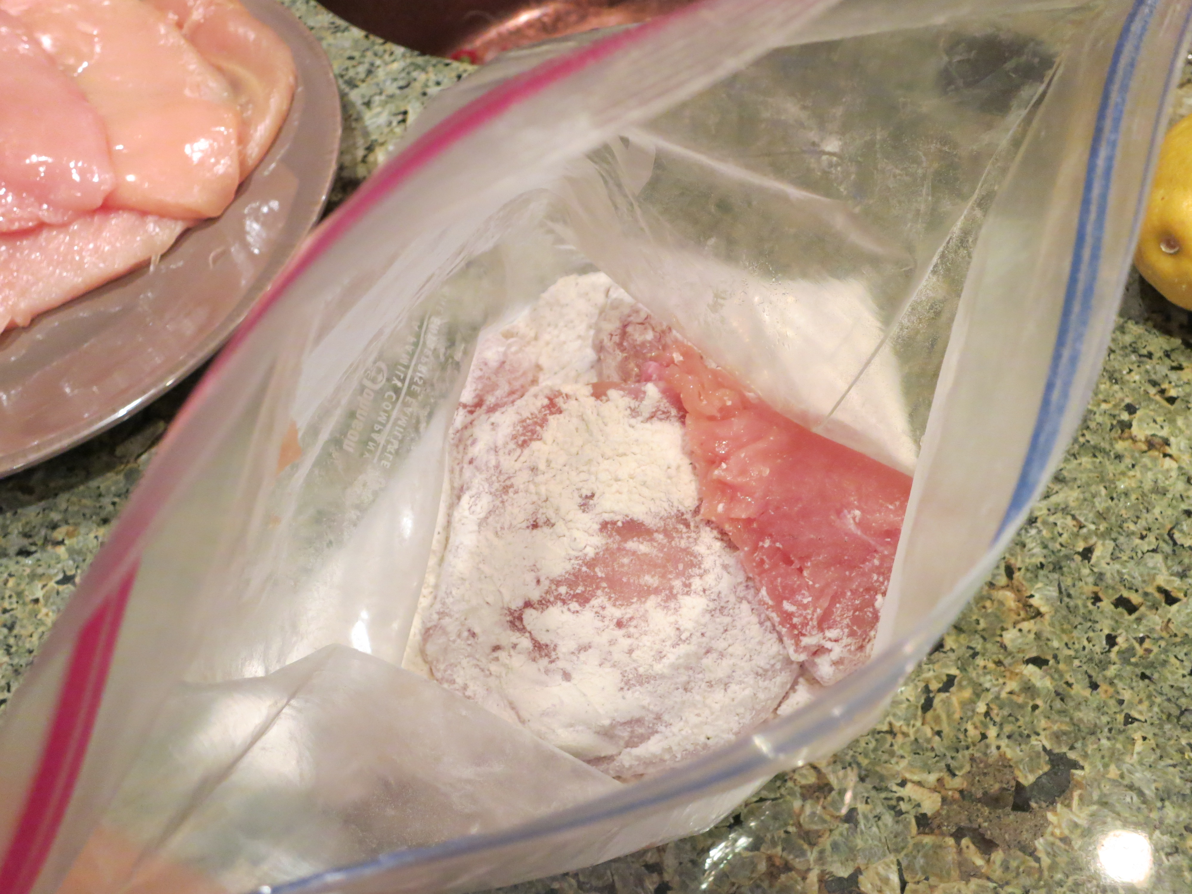 Place in a ziploc bag with flour, salt, pepper and paprika (optional – just adds a nice color).  Make sure all of chicken is completely coated and shake to remove excess flour.