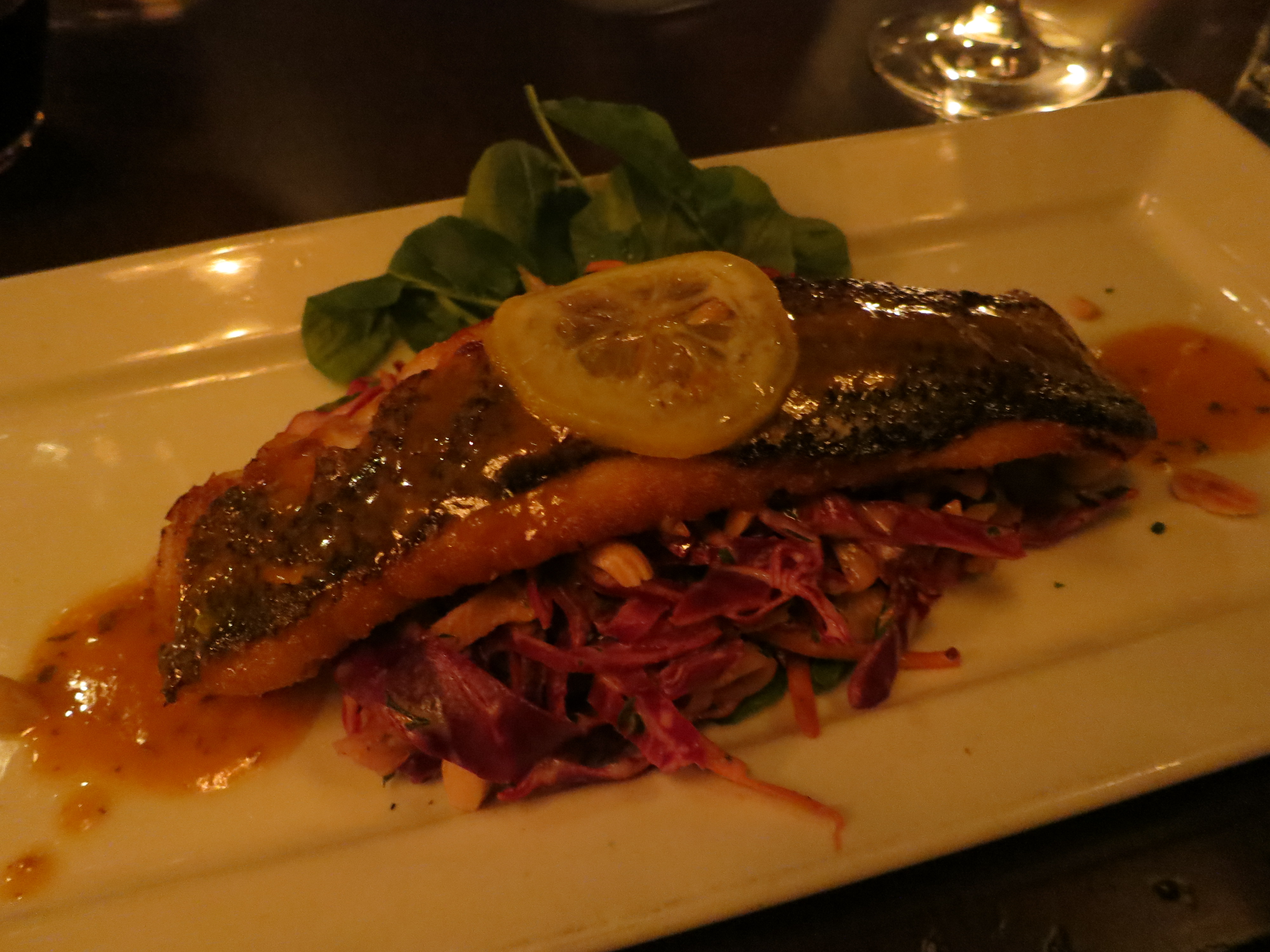 Colorado Striped Bass – warm red cabbage & fennel slaw, Spanish almonds, champagne caper emulsion