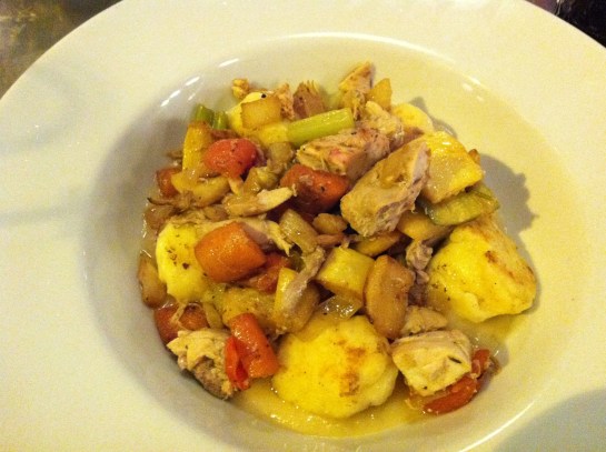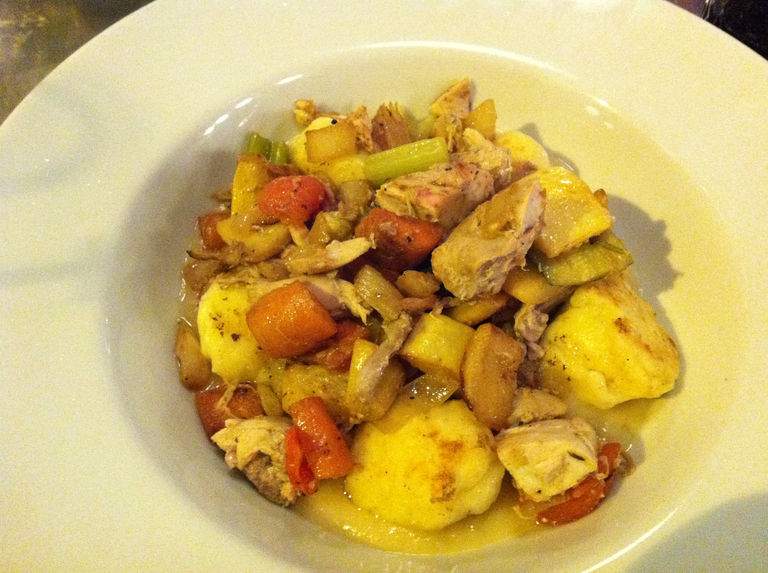 Friday night special: Chicken and Dumplings. Pretty good although there was a little too much of the same texture for me.