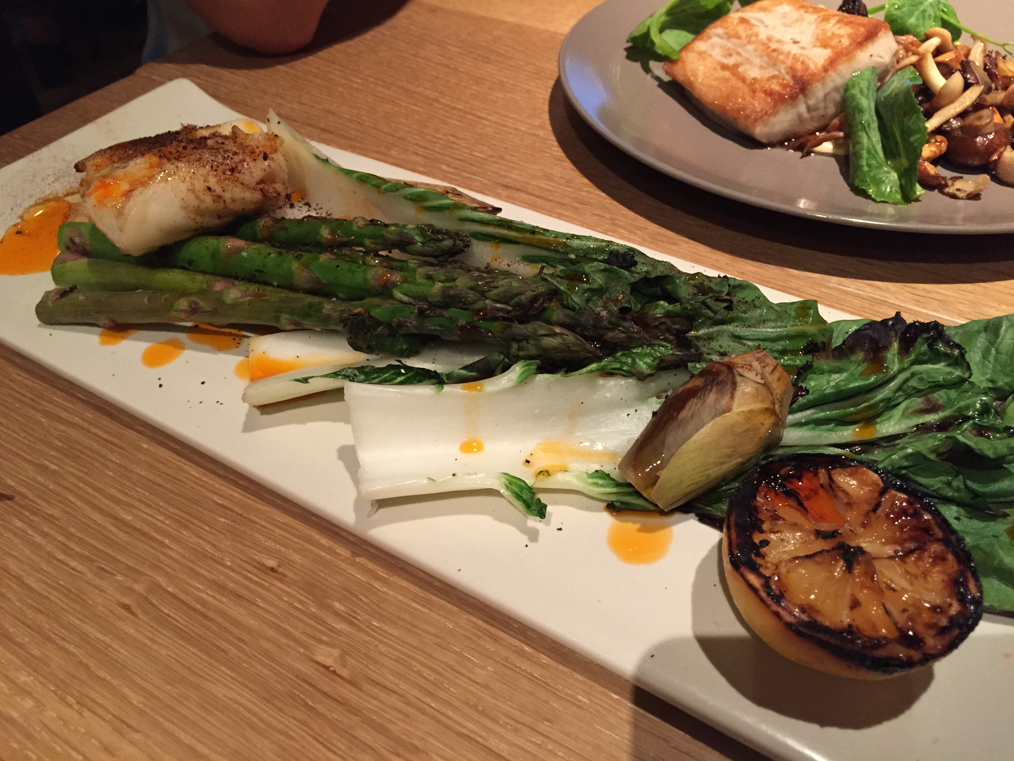 HALIBUT, black garlic, asparagus, baby artichokes, pak choi